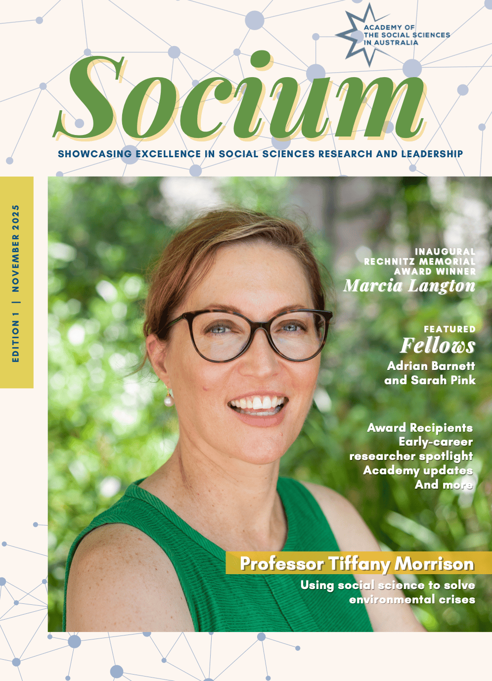 A hard copy of the first edition of the Academy’s new bi-annual magazine Socium was posted to all Academy Fellows last week. This new initiative makes visible the achievements of Fellows and the research of our award winners, as well as highlighting the impact of social science research on policy and for the community. Please contact fellowship@socialsciences.org.au if you have not received your copy or to suggest ideas for future magazine stories. The digital edition of Socium is available on the Academy’s website here.
